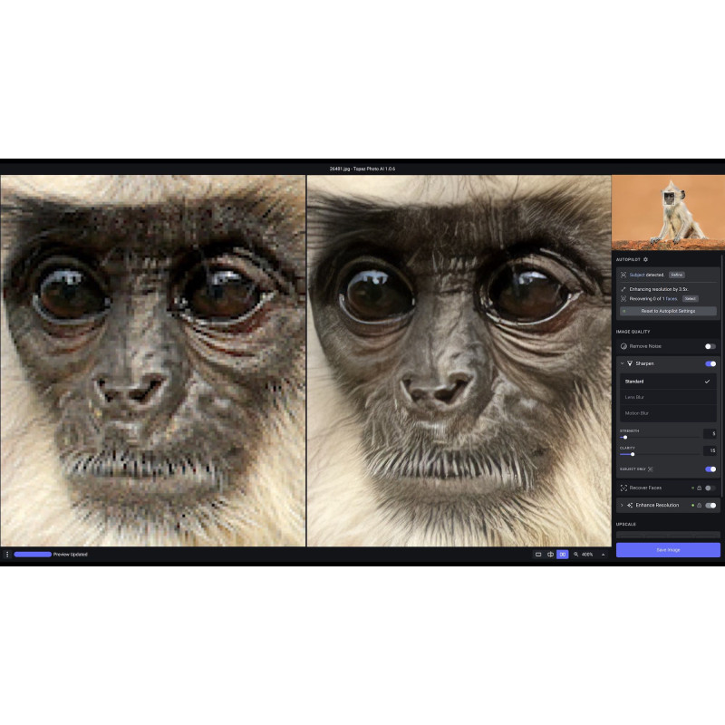 Topaz Photo AI — это мощное программное обеспечение, разработанное с использованием передовых технологий искусственного интеллекта, которое позволяет автоматически улучшать фотографии, делая их более четкими, насыщенными деталями и высокого качества. Основное назначение Topaz Photo AI — автоматическая коррекция качества фотографий благодаря инструментам для уменьшения шума, повышения резкости и масштабирования изображений без потери качества. Это делает его идеальным выбором для фотографов, дизайнеров и редакторов, которым нужно быстро получить отличный результат без сложной ручной обработки.